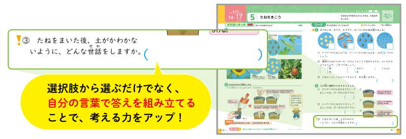 学習したことをもとに「考えて表現する」問題も掲載。日々の学習の中で思考力や表現力を鍛えていくことができます。