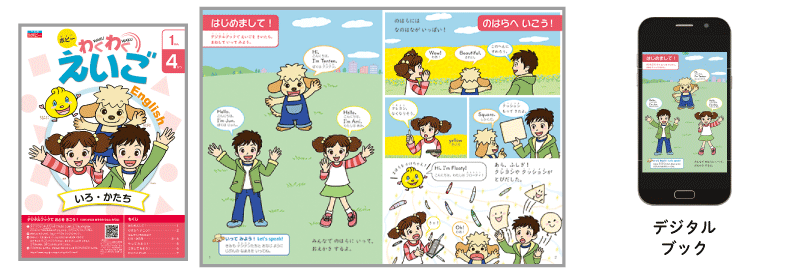 「自己紹介」や「道案内」などのテーマ別冊子を、学校で学ぶタイミングに合わせてお届け。ワークで予習・復習、テストも付いています。オンライン絵じてんでたくさんの単語に触れたり、デジタルブックの発音チェックでSpeakingの練習もできます。