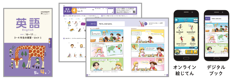 小学校で使う文科省の英語のテキストに合わせて学べます。オンライン絵じてんやデジタルブックで、リズムに乗せて楽しく英語の発音が学べます。