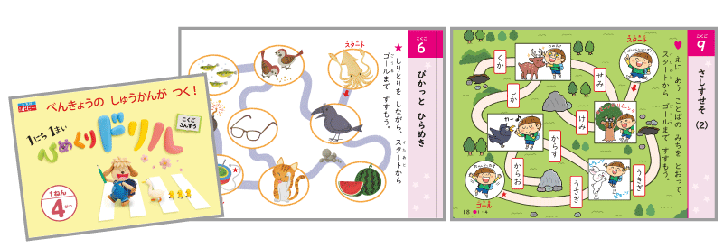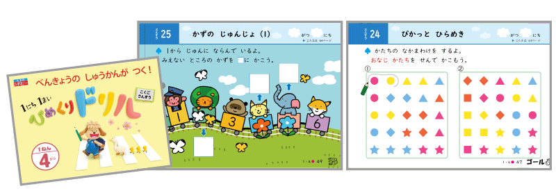 1日1枚5分程度で取り組めるドリルを毎月お届け。楽しいイラストの問題で、家庭学習の習慣が自然と身につきます。