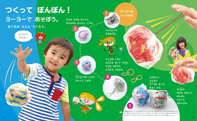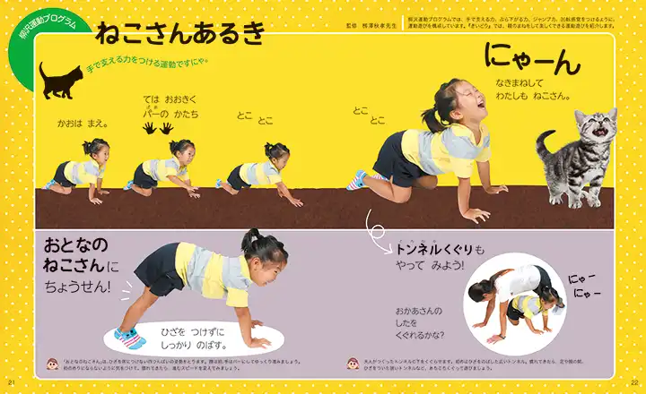 ジャンプ・まねっこ・リズム遊びなど、体を使って楽しめるテーマがたくさん。運動遊びは幼児運動学の専門家である栁澤秋孝先生の監修・指導のもと作られており、動きをともなう活動を通して運動能力だけでなく集中力や表現力も育ちます。