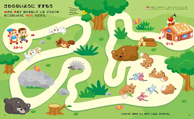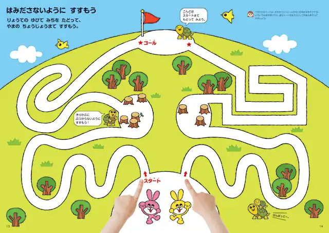 指先でなぞったり道をたどったりする迷路遊びを通して手先の器用さや、線からはみださないように注意することで集中力、どの道を進むか考えることで順序立てて考える力が伸びます。迷路をする中で数を数えたり、見つけの問題があったりと1ページ内に複合的な要素があり、子どもを飽きさせない工夫がちりばめられています。