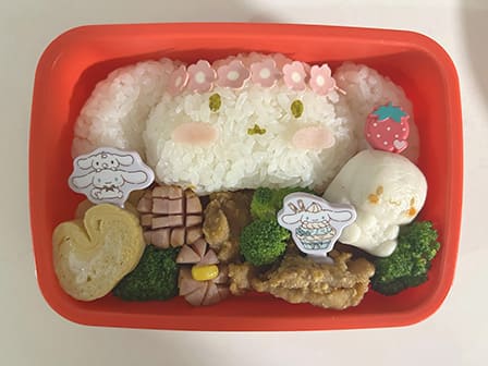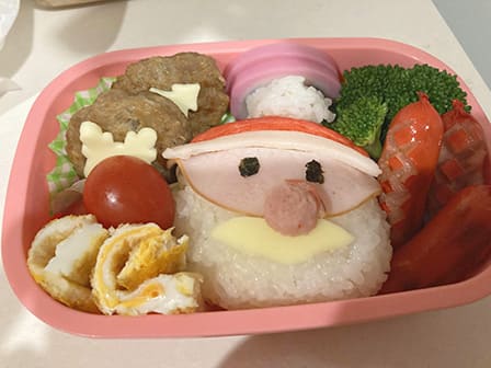 毎月1回幼稚園でお弁当を持っていく日があります。いつもはおにぎりとおかずという普通のお弁当ですが、誕生日のある12月はサンタクロースのお弁当を作りました。カニカマや海苔などさまざまな食材を使い、いつもより時間がかかって大変でした。しかし、帰ってきたとき、初めてのキャラ弁に子ども(5歳)がうれしそうに「ありがとう」と言ってくれたときは、こちらもがんばって作った甲斐があり、忘れられないお弁当になりました。