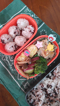 お弁当の日は、偏食の娘が食べられるように、ウインナー、ミートボール、おにぎりの三つで構成していたので、彩りが全然よくない仕上がりになっていたのですが、年中になり「卵焼き食べてみるから入れて」って言われたとき、とてもうれしかったです。「赤、黄の2色に彩りが増えて、かわいいね」って娘と喜べて、うれしかったです。緑も入れる日が来るのを、気長に待ちたいと思います。