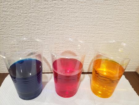 ③ ぬるま湯1カップと酢大さじ1をプラスチックカップなどに入れ、そこに食紅を加えてよく混ぜます。 (かき氷のシロップくらいの濃さの色水にするとよいです。)