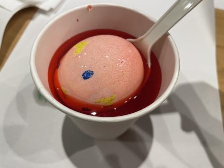 ④ スプーンにたまごをのせて、③の中にそっとたまごを沈めます。(5~10秒ほどでも色がつきます。好みの色になるまで、様子を見ながらたまごをつけます。)