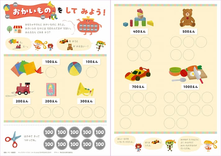 慣れてきたら、おもちゃのお財布の中にいくらあるかを意識して買い物ができるように声をかけましょう。下記の「おかいものシート」は、そんなお買い物ごっこを手軽に楽しめるアイテム。「どれを買いたい?」、「これは100円玉が何枚必要かな?」「お財布の中には100円玉がいくつ入ってる?」などと声をかけながら一緒に考えることで、限られたお金の中で、何を買うか考える体験ができます。