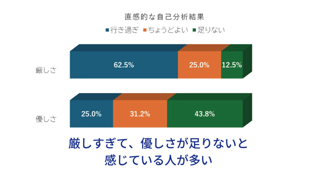 - 直感的な自己分析では、自分は厳しすぎ、逆に優しさが足りないと感じている方が多いようです。