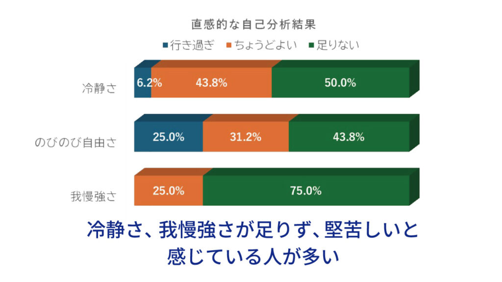 - 直感的な自己分析では、「冷静さ我慢づよさが足りず、少し堅苦しい」と感じているおうちの方が多いようです。