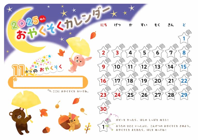 おやくそくカレンダーは、お子さんの頑張りを見える化し、おうちのかたと共有することで、「また明日も頑張ろう!」につながります。ぜひご活用ください。