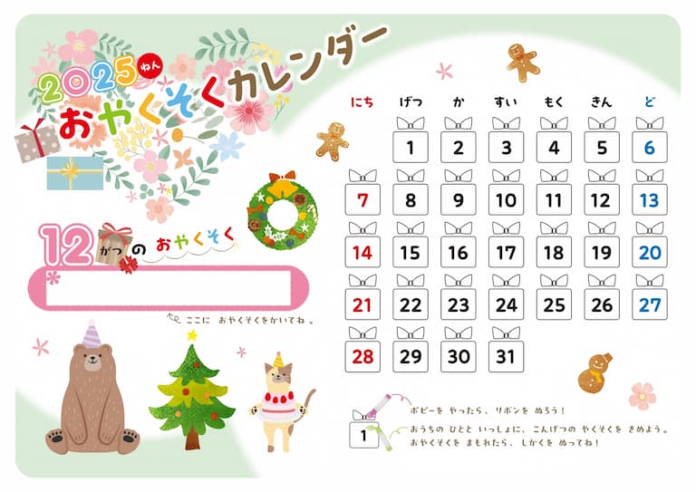 ① おやくそくカレンダーをダウンロードして、印刷する。