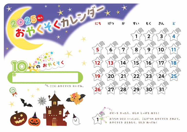 ポピーをやった日や、おうちで決めた約束を守れた日に、色をぬっていく「ポピーおやくそくカレンダー」をお届け。