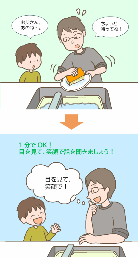 ほんの1分でOKです。子どもの目を見て、笑顔で話を聞くことを意識するだけで、子どもは安心し、親子関係が密になります。