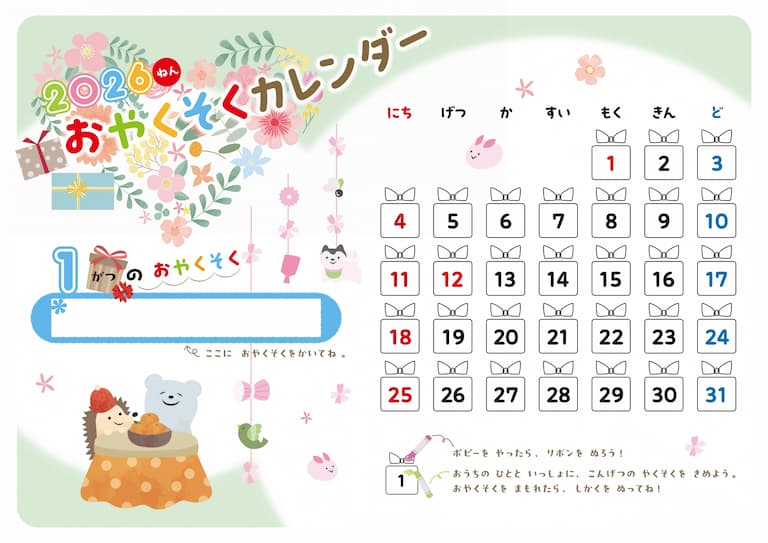 ① おやくそくカレンダーをダウンロードして、印刷する。