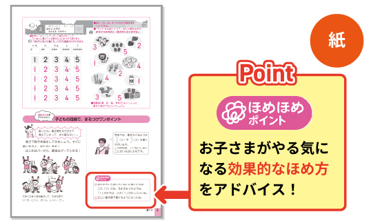 ポピーの「答えとてびき」は、問題の解説やアドバイスが満載です。手助けが必要な1・2年生のうちは、楽しく学ぶ方法や、お子さまをやる気にさせるための「ほめほめポイント」など、おうちの方へのアドバイスも充実しているので安心!