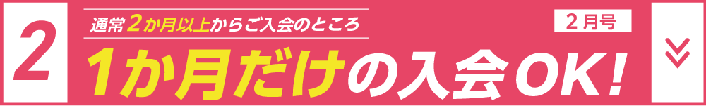 通常入会だと最短でも2か月以上のご継続が必要なところを、「2月号」1か月分だけの入会ができるキャンペーンです。