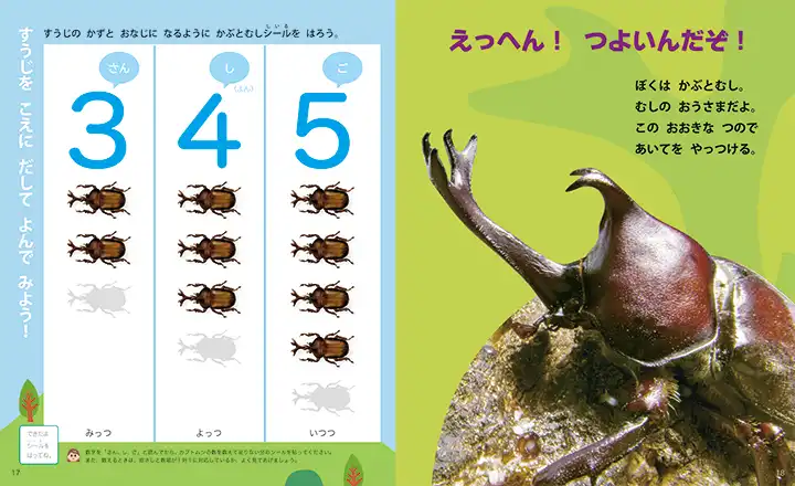 図鑑のような写真やイラストが豊富に登場し、動物や虫が好きなお子さまの興味を引きつけます。虫の写真を使った問題など、好きなものと学びを結びつけることで、お子さまの「やってみたい!」という好奇心を刺激し、遊び感覚で学べるように工夫されています。