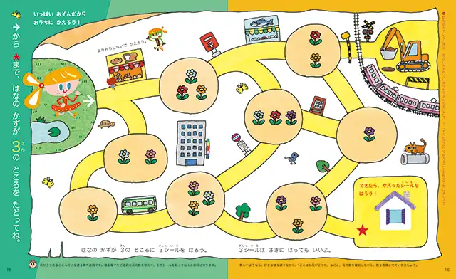 指先でなぞったり道をたどったりする迷路遊びを通して手先の器用さや、線からはみださないように注意することで集中力、どの道を進むか考えることで順序立てて考える力が伸びます。迷路をする中で数を数えたり、見つけの問題があったりと1ページ内に複合的な要素があり、子どもを飽きさせない工夫がちりばめられています。